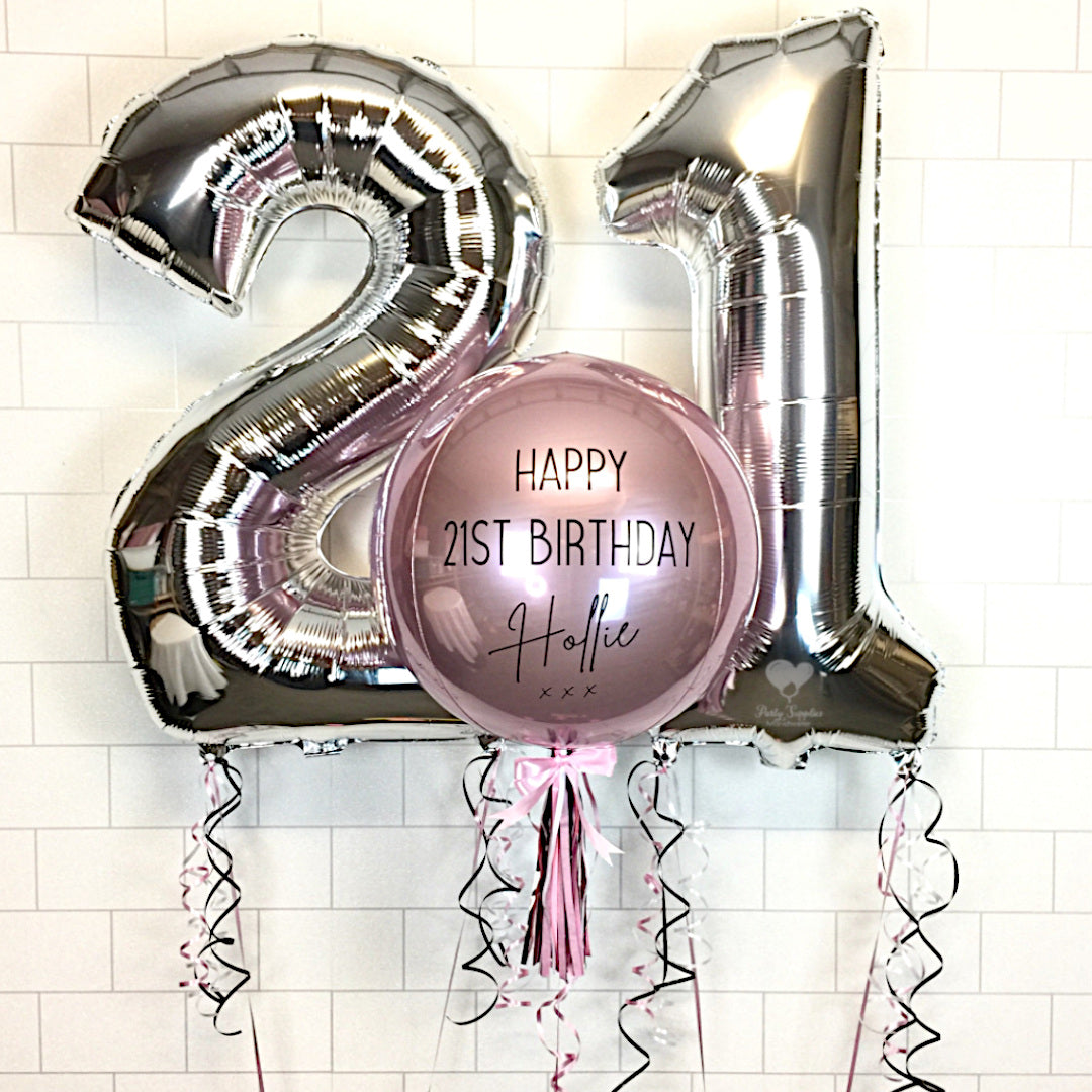 This design includes a Pink Orbz Balloon Personalised with a Black Vinyl Message Dressed with Tassel, Bow & Weight, 2 Silver Large Helium Filled Numbers.