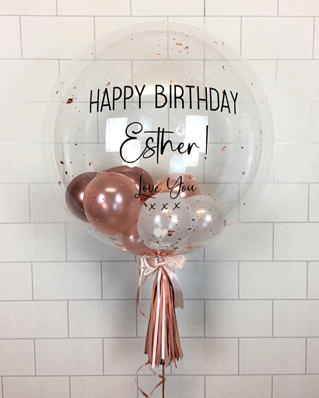 This design includes a Clear Bubble Balloon filled with White & 2 Shades of Rose Gold Balloons with Rose Gold Leaf Dressed with a Black Personalised Message, Tassel Bow & Weight