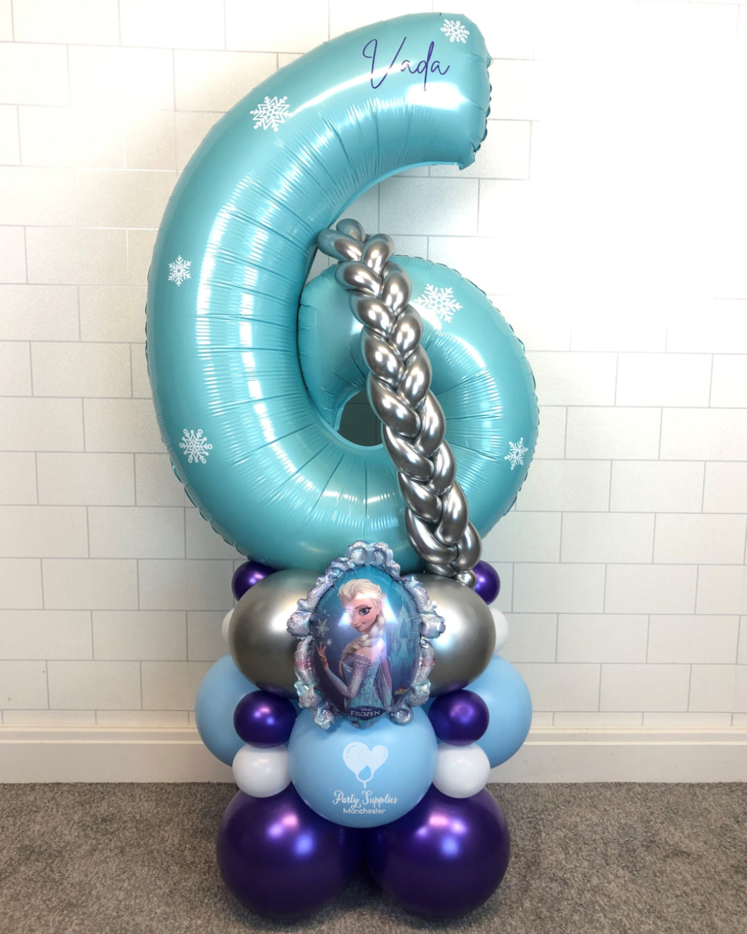 The design includes Purple, Blue & Silver Balloon Base, 1 Small Frozen Shape, 1 Silver Plait, 1 Large Baby Blue Large Number Personalised with a Purple Name & white Snowflakes, extra items added to this design will incur extra charges.