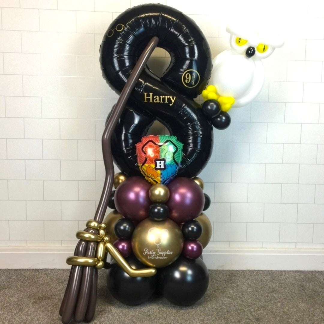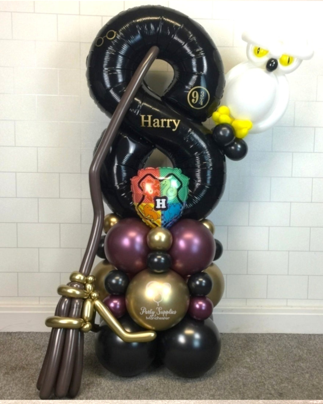 Designs shown include 1 Burgundy, Gold & Black Balloon Base, 1 Mini Harry Potter Sheild, 1 Black Number with Owl & Broom Personalised with a Gold Name, Glasses & Platform extra items added to this design will incur extra charges.