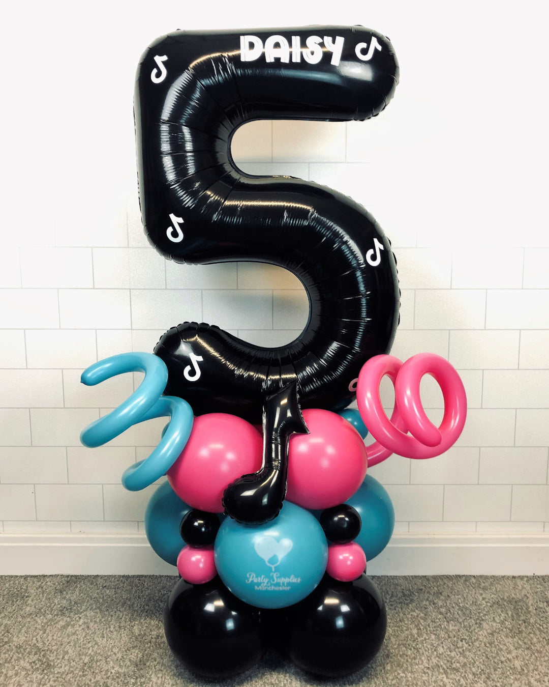 The design includes Pink, Blue & Black themed Balloon Base, 1 Small Musical Note, 1 Large Black Number, Personalised with a White Name & Musical Notes, extra items added to this design will incur extra charges.