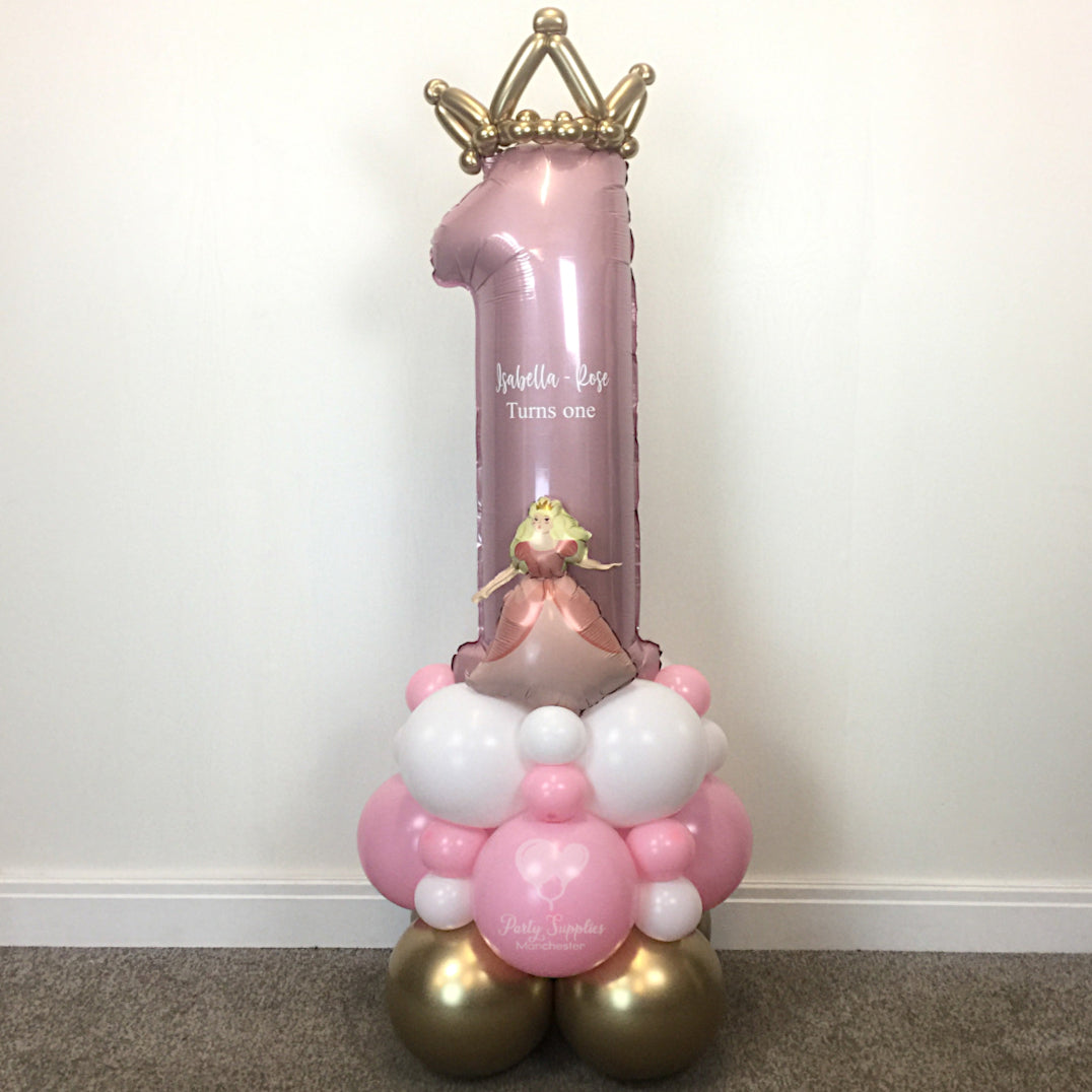 Design includes Pink Gold & White Balloon Base, 1 Princess Shape, 1 Large Baby Pink Number finished with a White Personalised Name & Crown