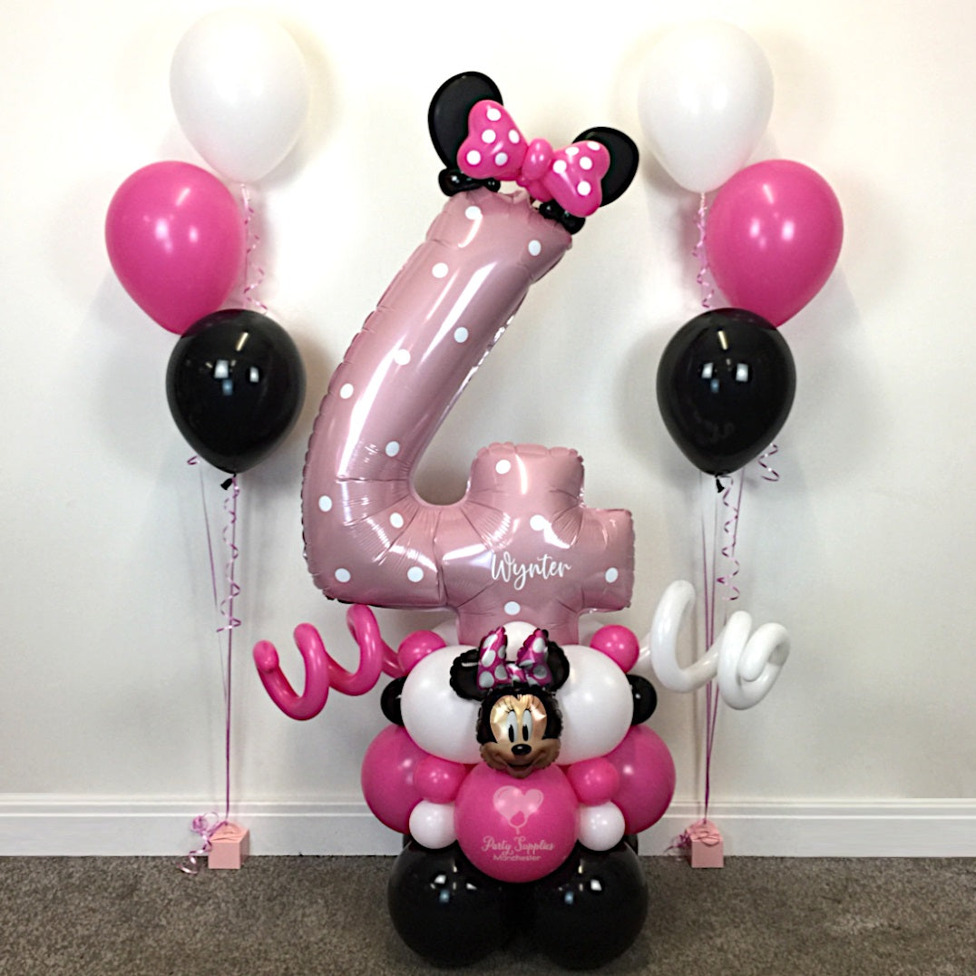 The design includes Pink, Black & White Pink Balloon Base, 1 Minnie Mouse Mini Shape, 1 Large Baby Pink Number Bow & Ears, Spots & Personalisation with a First Name in White Vinyl. 2 Sets of 3 Balloon Clusters.