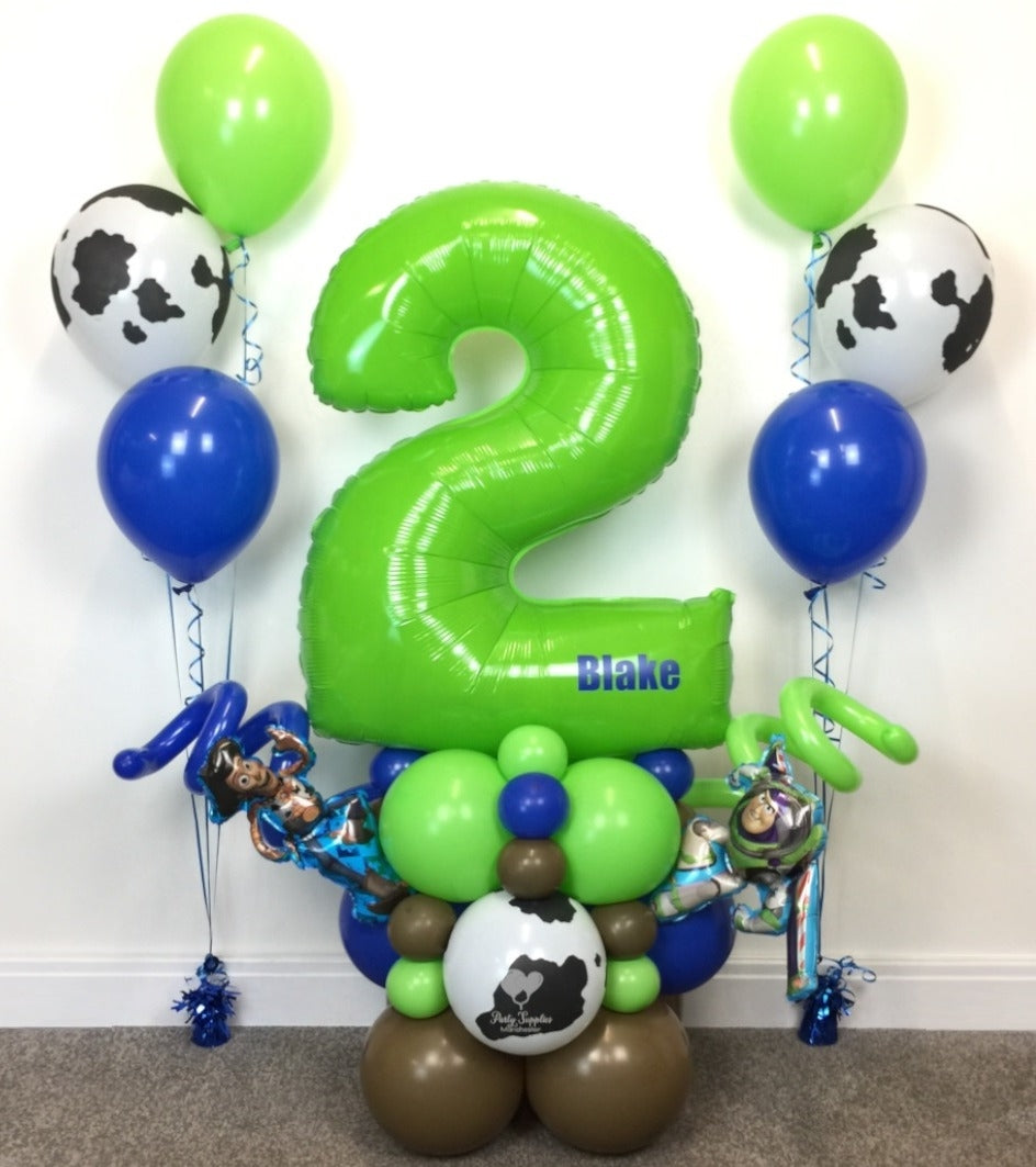 Designs shown include Brown, Blue, Green & Cow print Balloon Base, 1 Blue Large Number Personalised with a Name, 1 Woody Mini Shape & 1 Buzz Lightyear Mini Shape & Twists + 2 Latex 3 Balloon Clusters in matching balloons extra items added to this design will incur extra charges.