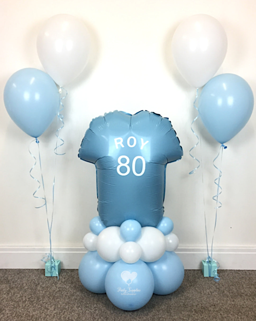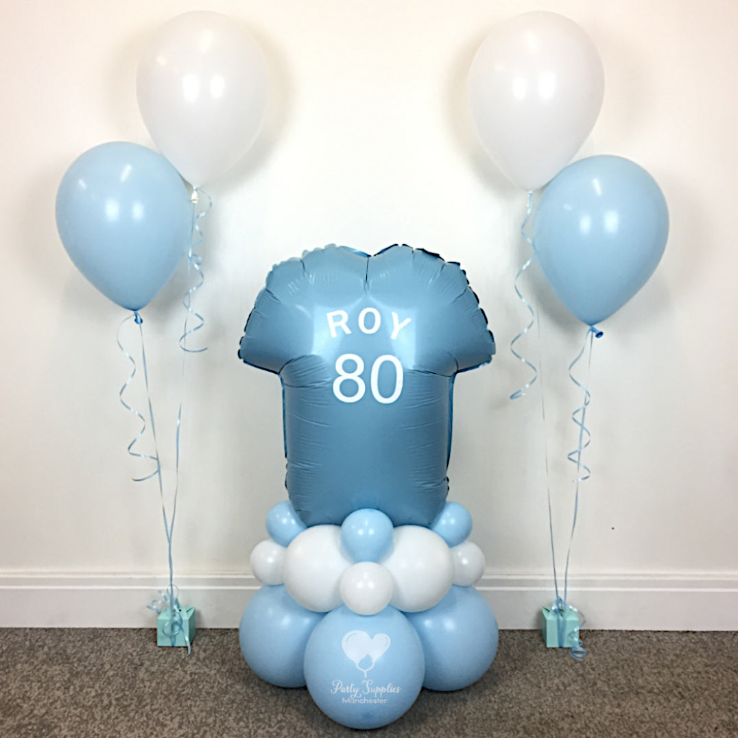 The design includes blue & white balloon base, 1 T-Shirt personalised with a white name & football on the front and name & number on the back & 2 Sets of blue & white 2 balloon clusters.