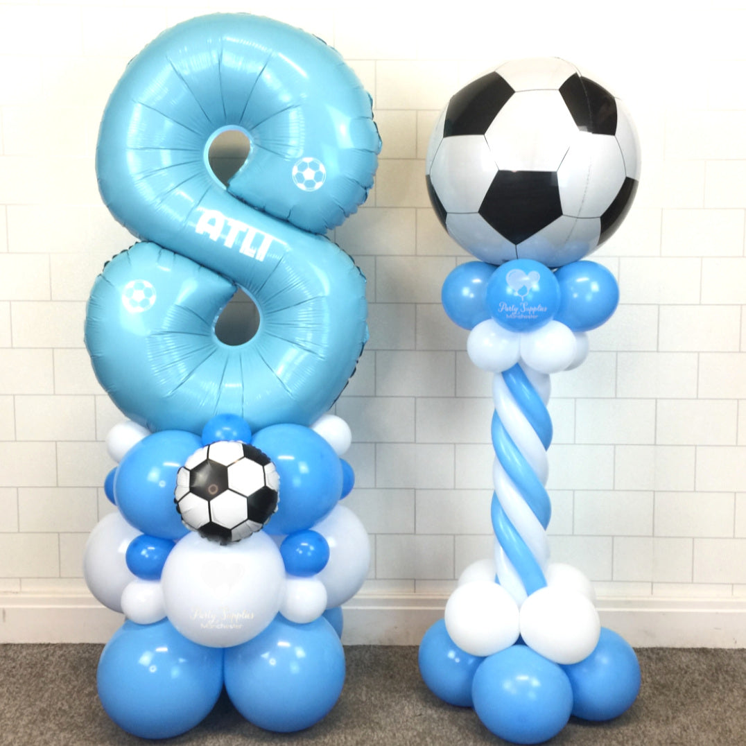 The design includes a Blue & White Balloon Base, 1 Football Mini Shape, 1 Large Blue Number finished with a White Personalised Name & 1 White & Blue Twisted Tower Topped with a Football Bob Orbz.