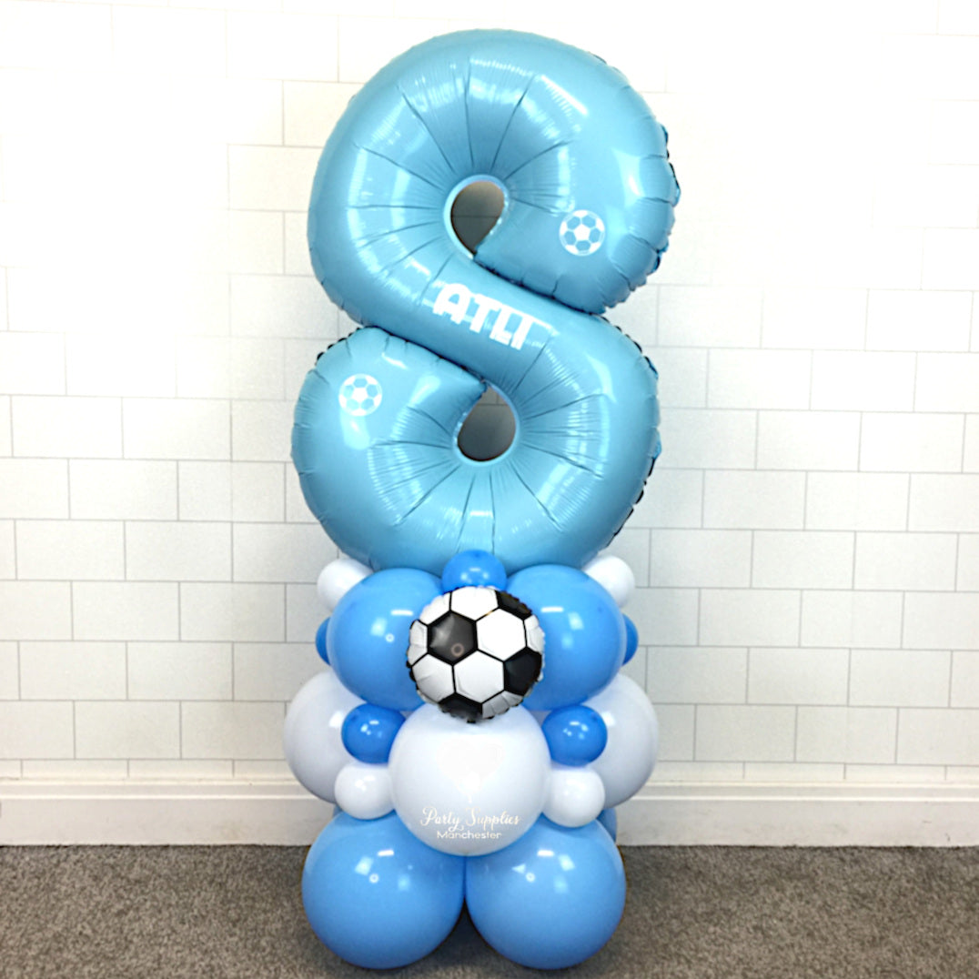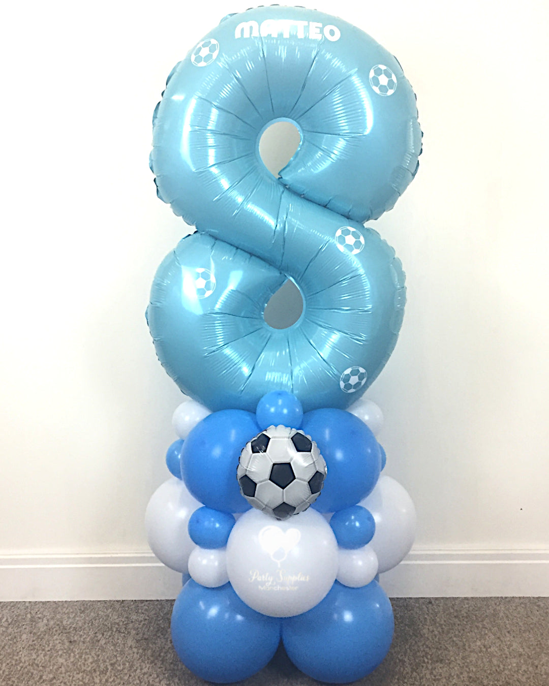The Design includes Blue & White Balloon Base, 1 Football Mini Shape, 1 Blue Large Number Personalised with a Name & Footballs