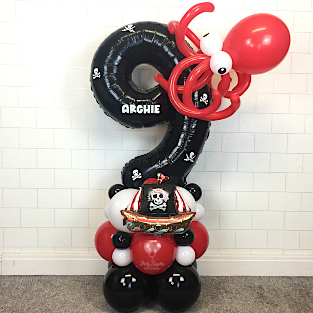 Designs shown include Red White & Black Balloon Base, 1 Black Large Number, 1 Pirate Ship Mini Shape & Octopus Personalised with a Name, extra items added to this design will incur extra charges.