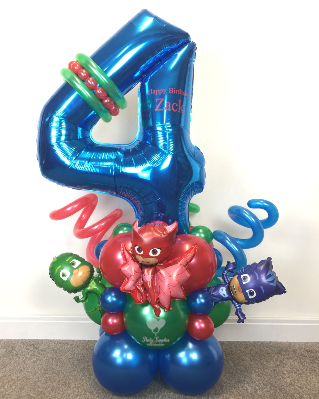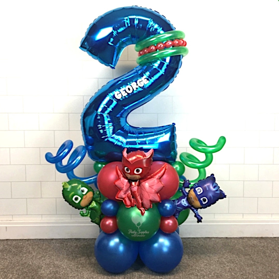 Designs shown include Blue, Green & Red Balloon Base, 1 Blue Large Number, 3 PJ Mask Mini Shapes, Personalised with a Name, extra items added to this design will incur extra charges.