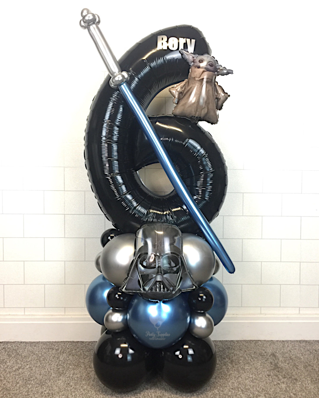 The design includes a Black, Blue & Silver Balloon Base, 1 Yoda Mini Shape, 1 Darth Vadar Mini Shape, 1 Lightsaber, 1 Large Black Number Personalised with a Silver Name