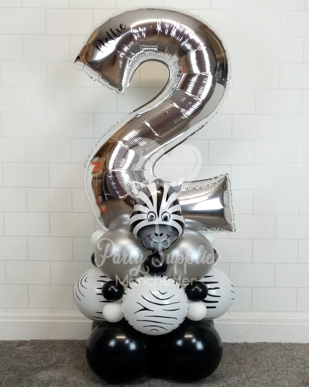 The Design includes Black White & Silver Balloon Base, 1 Zebra Shape, 1 Large Silver Number finished with a Black Personalised Name