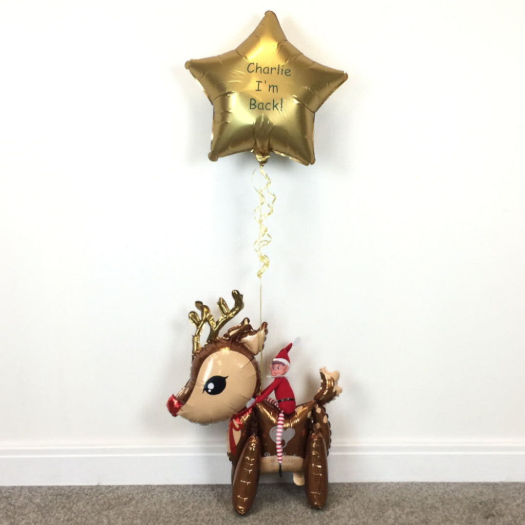 Design shown includes 1 Elf, 1 Reindeer, 1 I'am Back Personalised Gold Star Balloon, extra items added to this design will incur extra charges.