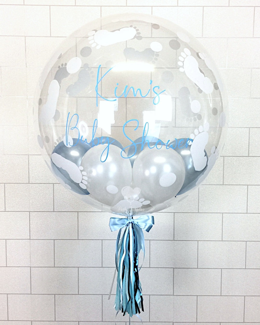 This design includes a Baby Footprint Bubble Balloon filled with 2 Shades of Blue & White Balloons, Dressed with a Light Blue Personalised Message, Tassel & Bow.