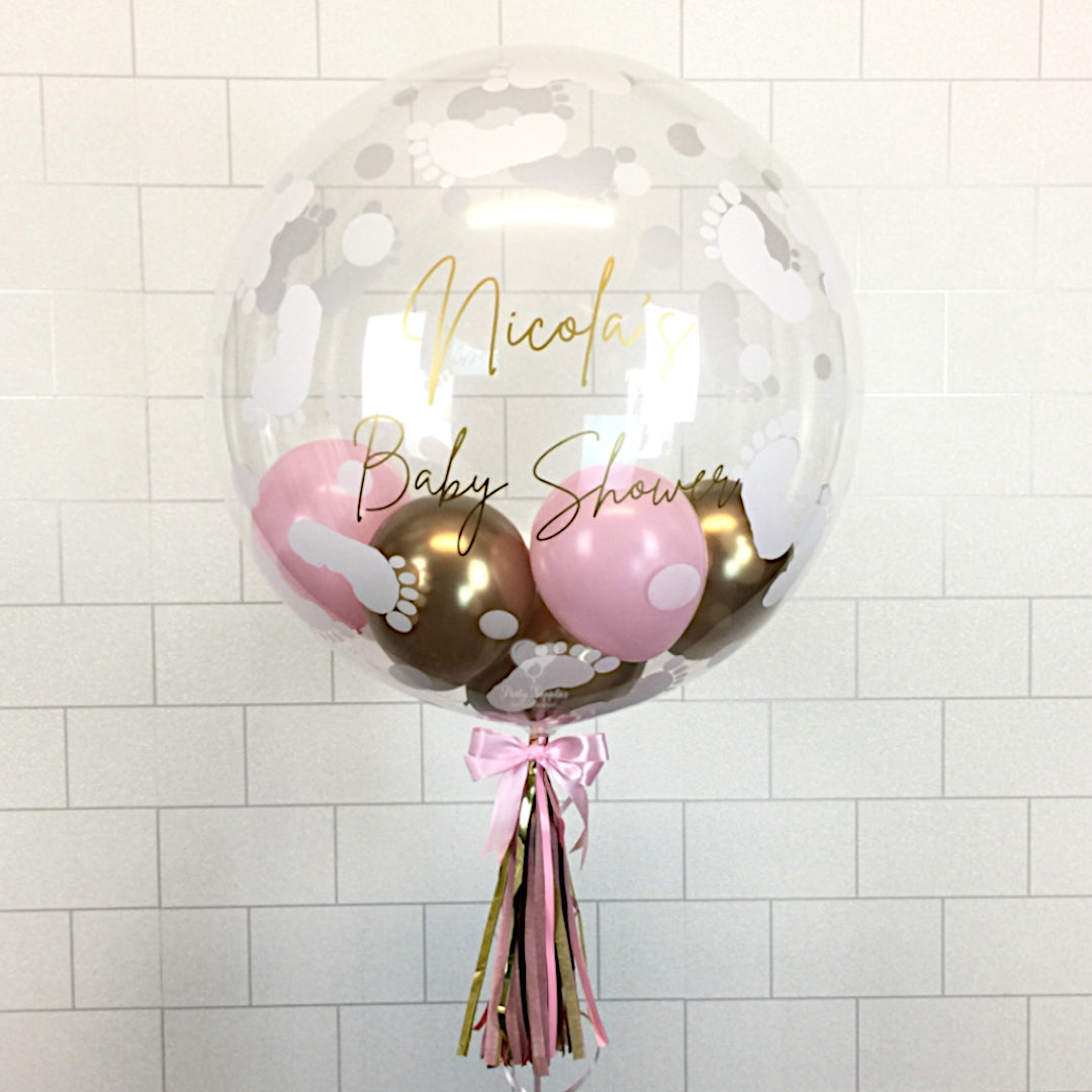 This design includes a Baby Footprint Bubble Balloon filled with Pink & Gold Balloons, Dressed with a Gold Personalised Message, Tassel & Bow.