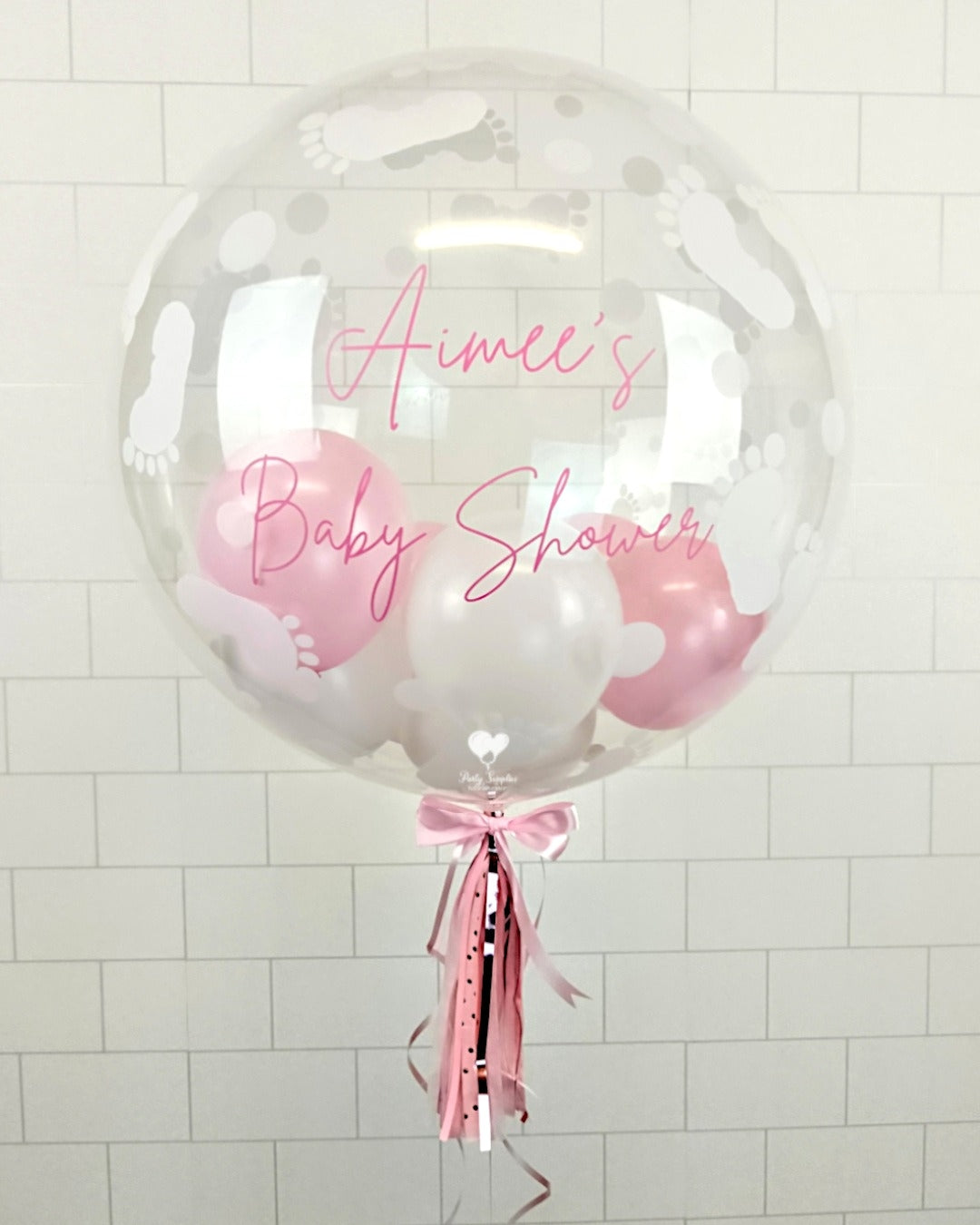This design includes a Baby Footprint Bubble Balloon filled with 2 Shades of Pink & White Balloons, Dressed with a Pink Personalised Message, Tassel & Bow.