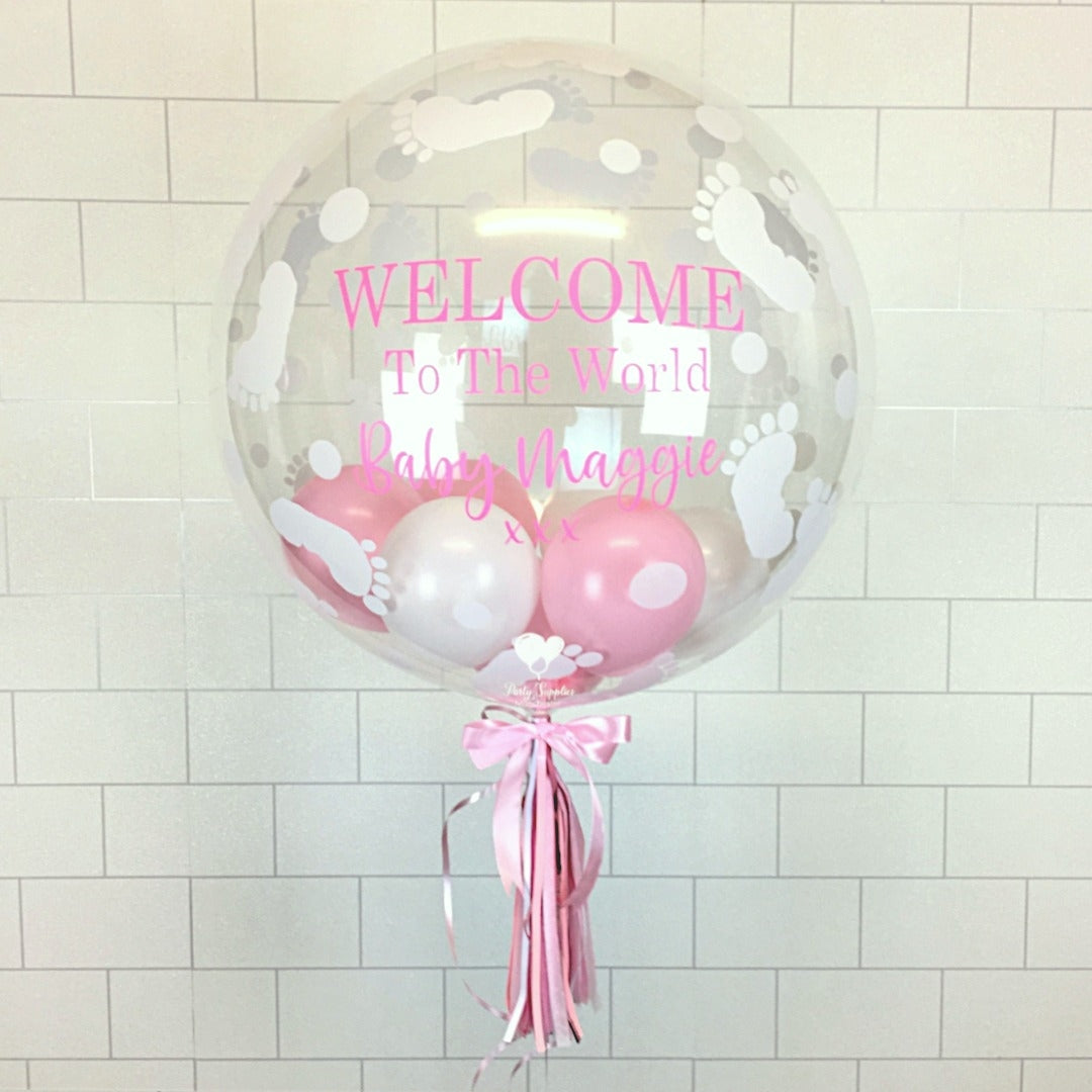 This design includes a Baby Footprint Bubble Balloon filled with Pink & White Balloons, Dressed with a Pink Personalised Message, Tassel & Bow.